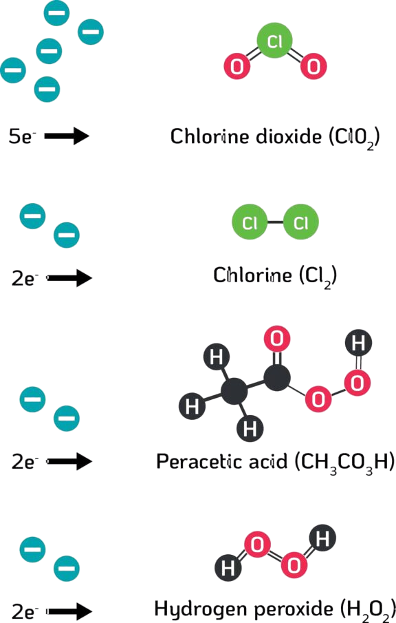 As an oxidiser, ClO₂ has the capability to obtain electrons from nearby molecules. It can obtain five electrons in total from surrounding molecules, making it a superior biocide to alternative oxidisers. Those alternatives include aqueous chlorine, peracetic acid and hydrogen peroxide, which are only able to gain two electrons2,3.