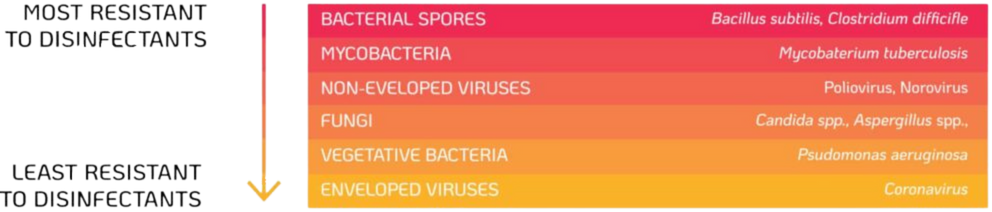 Viruses are either enveloped or non-enveloped. According to the Centers for Disease Control and Prevention (CDC), enveloped viruses are regarded by scientists as the least resistant group of microorganisms for disinfectants to inactivate. Vegetative bacteria, fungi, non-enveloped viruses, mycobacteria and bacterial spores are all deemed more resistant for disinfectants to inactivate4.