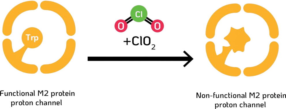 Other peptides were also found to be modified at tryptophan and tyrosine residues; this was suggested to be on other vital proteins such as the Matrix-2 (M2) protein in the viral envelope. The M2 protein of influenza A is a proton channel which balances the pH across the viral membrane during cell entry, triggering the release of the viral genome into the host cell, so that viral replication can occur8. A tryptophan residue protrudes into the M2 protein channel and acts as a gate for protons. As ClO₂ reacts with tryptophan in various peptides, it is likely that the tryptophan residue in the M2 protein channel was also modified by ClO₂, resulting in its key functionality ceasing.