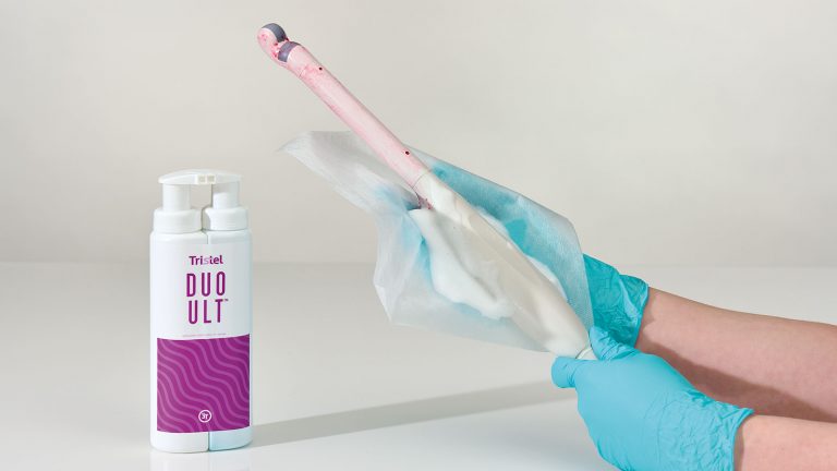La mousse Tristel DUO ULT assure une désinfection de haut niveau de votre dispositif en seulement 30 secondes. Elle oxyde VISICLEAN et fait disparaître le colorant de la surface de la sonde. Tristel DUO ULT est sporicide, mycobactéricide, virucide, fongicide, levuricide et bactéricide en seulement 30 secondes.