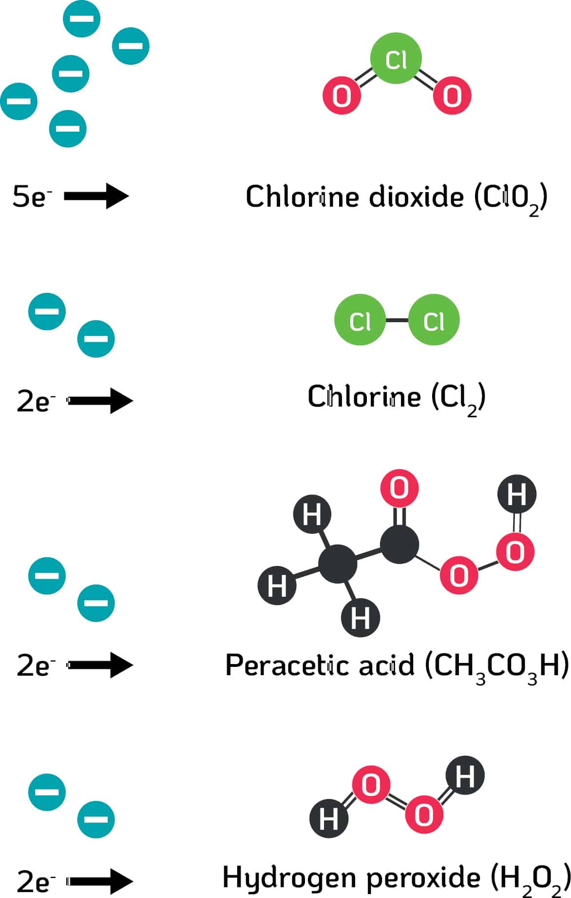 ClO2 is an oxidiser, as it has the capability to obtain electrons from nearby molecules, i.e. viruses. ClO2 can obtain five electrons in total from surrounding molecules, making it a superior biocide to alternative oxidisers, such as aqueous chlorine, peracetic acid and hydrogen peroxide, which are only able to gain two electrons (Fukayama et al., 1986) (Miura and Shibata, 2010) (Figure 2).