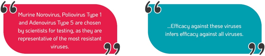 Poliovirus and HAV are both non-enveloped viruses, which are the most resistant to disinfectants. Having efficacy against these viruses infers efficacy against other viruses of similar structure and the less resistant enveloped viruses.