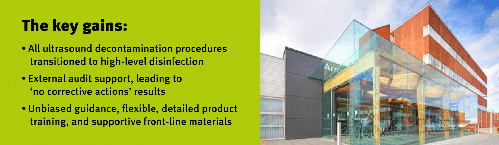 When it came to fortifying infection prevention control measures, Pat saw Wirral University Teaching Hospital’s ultrasound decontamination procedures as a key area. The hospital had clearly identified the requirement to use high-level disinfection (HLD) products for decontaminating ultrasound devices used on broken skin, as Pat explains: