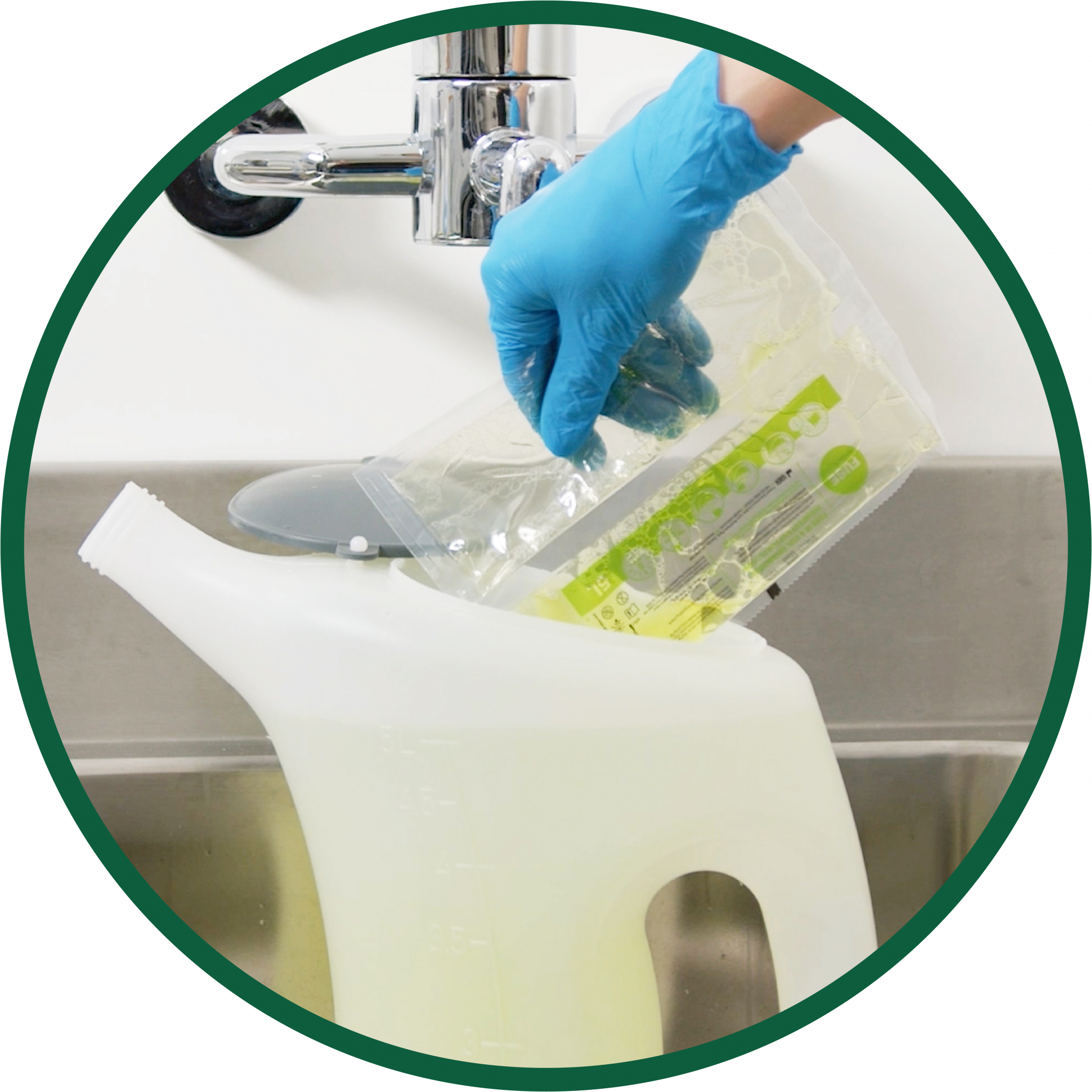 Fuse for Medical Surfaces nutzt denselben Wirkstoff wie unsere anderen Tristel-Desinfektionsmittel für Medizinprodukte. Fuse besteht aus einem Päckchen mit zwei Kammern, welche die Basislösung (Zitronensäure) und die Aktivatorlösung (Natriumchlorit) enthalten. Wenn sie gemischt werden, entsteht Chlordioxid. ClO2 zerstört pathogene Organismen durch Oxidation. Dadurch können Mikroorganismen keine Resistenzen gegenüber Chlordioxid entwickeln. Zudem entfernt Chlordioxid mit der Zeit Biofilme und andere hartnäckige Ablagerungen von Oberflächen.