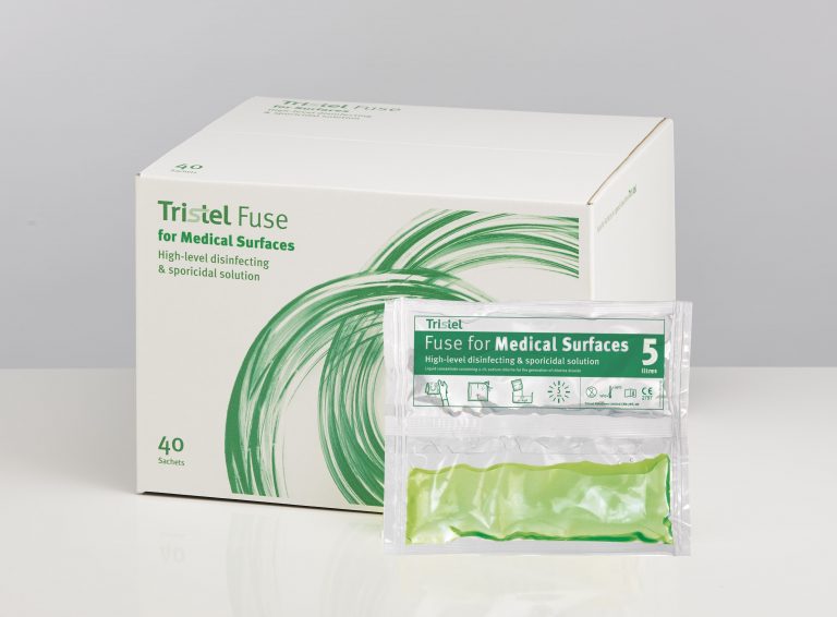 Tristel Fuse for Medical Surfaces ist als Karton aus 40 Päckchen Konzentrat für je 5 L Desinfektionslösung.