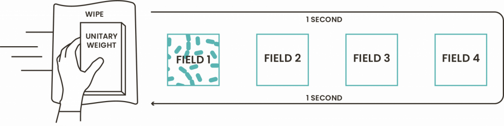 EN 16615 is designed to evaluate the performance of disinfectants when applied with a wipe. In this test, the pre-impregnated wipe is then wrapped around a standardised weight and moved across four test fields. The first of these fields is inoculated with microorganisms and an interfering substance. After wiping, the microbial load on the first field is measured to assess both the disinfectant’s efficacy and on the other three fields whether microorganisms have been spread across the surface rather than eliminated.